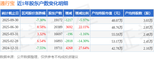 从股价来看,2025年6月30日至2025年9月30日,通行宝区间跌幅为7.3%,在此期间股东户数减少1217.0户,减幅为5.97%。