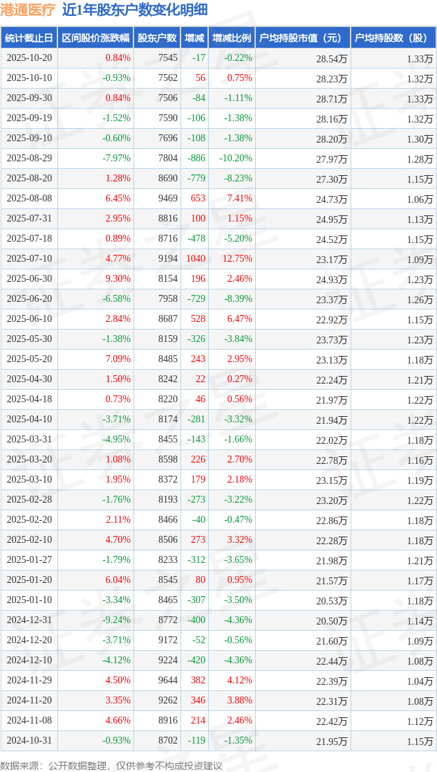 从股价来看,2025年10月10日至2025年10月20日,港通医疗区间涨幅为0.84%,在此期间股东户数减少17.0户,减幅为0.22%。