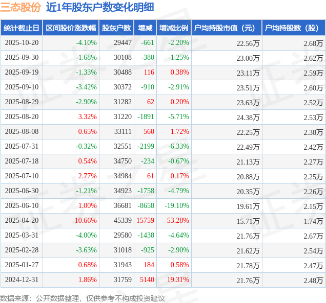 从股价来看,2025年9月30日至2025年10月20日,三态股份区间跌幅为4.1%,在此期间股东户数减少661.0户,减幅为2.2%。