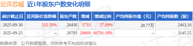 从股价来看,2025年9月25日至2025年9月30日,云汉芯城区间涨幅为332.59%,在此期间股东户数增加5733.0户,增幅为27.69%。