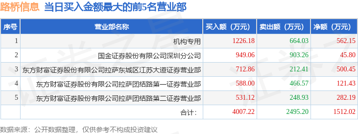 证券之星消息,沪深交易所2025年10月29日公布的交易公开信息显示,路桥信息(920748)因当日价格振幅达到30%的前5只股票登上龙虎榜。此次是近5个交易日内第2次上榜。