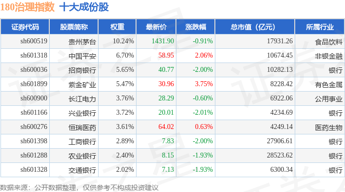 180治理(000021)指数十大成份股详情如下: