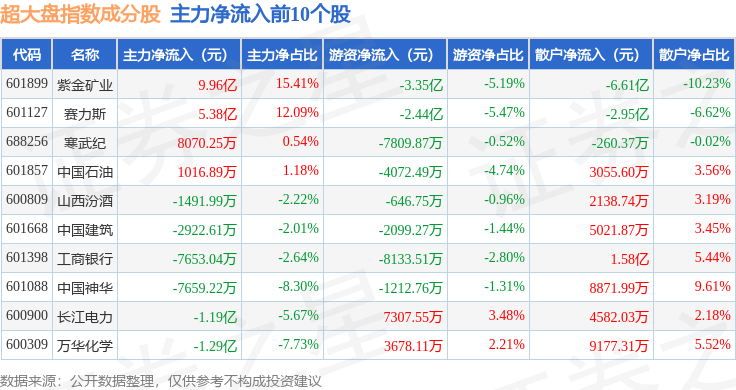 资金流向方面,超大盘(000043)指数成份股当日主力资金净流出合计30.58亿元,游资资金净流入合计18.05亿元,散户资金净流入合计12.53亿元。成份股资金流向详情见下表: