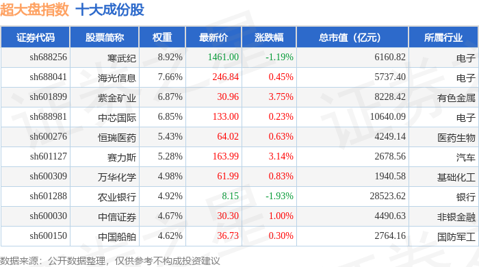 证券之星消息,10月29日,超大盘(000043)指数报收于2686.24点,涨0.02%,成交878.68亿元,换手率0.25%。当日该指数成份股中,上涨的有9家,紫金矿业以3.75%的涨幅领涨,下跌的有11家,兴业银行以2.01%的跌幅领跌。