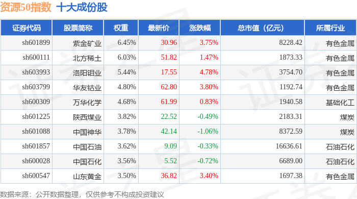 证券之星消息,10月29日,资源50(000092)指数报收于4600.53点,涨2.67%,成交769.43亿元,换手率0.81%。当日该指数成份股中,上涨的有42家,南山铝业以10.12%的涨幅领涨,下跌的有8家,中国神华以1.06%的跌幅领跌。