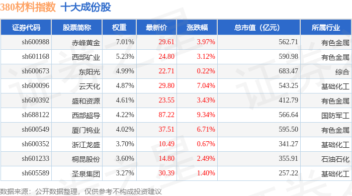 380材料(000105)指数十大成份股详情如下: