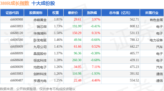 证券之星消息,10月29日,380R成长(000119)指数报收于4431.93点,涨1.66%,成交1702.34亿元,换手率2.16%。当日该指数成份股中,上涨的有209家,阿特斯以19.97%的涨幅领涨,下跌的有69家,安集科技以5.78%的跌幅领跌。