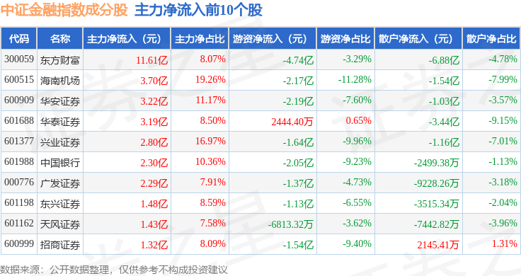 资金流向方面,中证金融(000934)指数成份股当日主力资金净流入合计8.12亿元,游资资金净流出合计20.76亿元,散户资金净流入合计12.64亿元。成份股资金流向详情见下表: