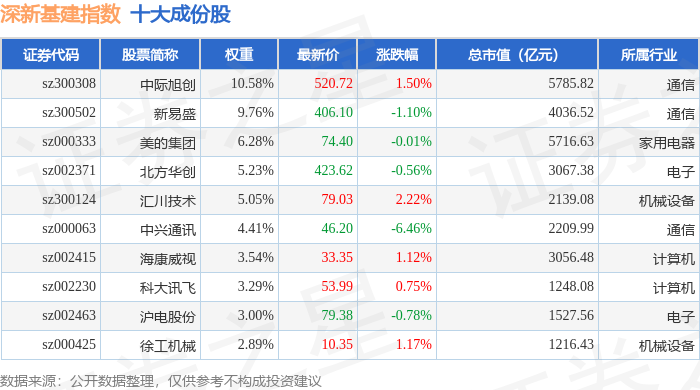 证券之星消息,10月29日,深新基建(399274)指数报收于6060.65点,涨0.81%,成交1605.44亿元,换手率2.66%。当日该指数成份股中,上涨的有37家,三环集团以10.25%的涨幅领涨,下跌的有13家,中兴通讯以6.46%的跌幅领跌。