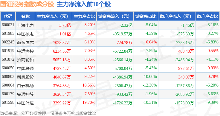 资金流向方面,国证服务(399320)指数成份股当日主力资金净流入合计5437.69万元,游资资金净流出合计7.01亿元,散户资金净流入合计6.47亿元。成份股资金流向详情见下表: