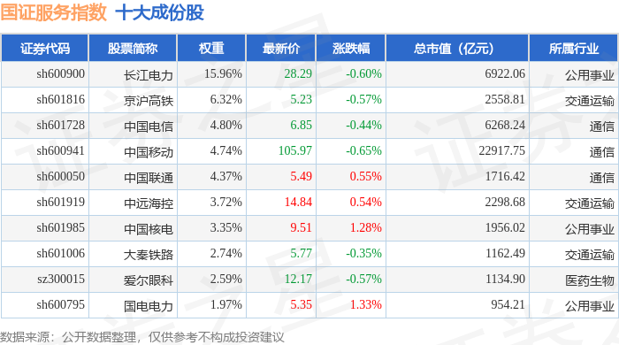 证券之星消息,10月29日,国证服务(399320)指数报收于2232.3点,涨0.5%,成交426.86亿元,换手率0.71%。当日该指数成份股中,上涨的有63家,上海电力以10.0%的涨幅领涨,下跌的有30家,青岛港以3.27%的跌幅领跌。
