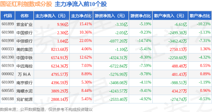 资金流向方面,国证红利(399321)指数成份股当日主力资金净流出合计32.35亿元,游资资金净流入合计5.47亿元,散户资金净流入合计26.88亿元。成份股资金流向详情见下表: