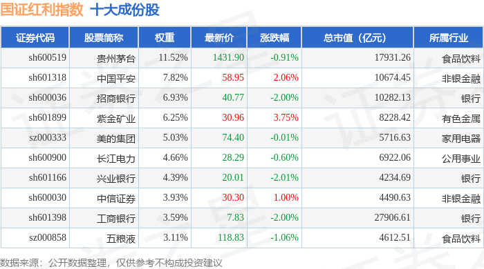 国证红利(399321)指数十大成份股详情如下: