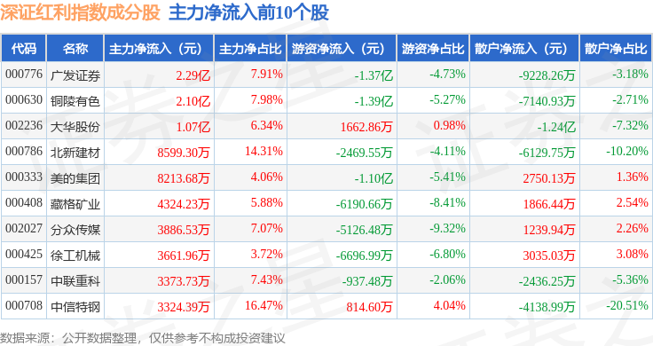 资金流向方面,深证红利(399324)指数成份股当日主力资金净流出合计2.51亿元,游资资金净流出合计5.56亿元,散户资金净流入合计8.07亿元。成份股资金流向详情见下表: