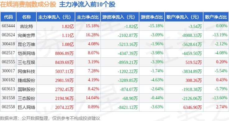 资金流向方面,在线消费(399361)指数成份股当日主力资金净流出合计6.04亿元,游资资金净流出合计2.88亿元,散户资金净流入合计8.92亿元。成份股资金流向详情见下表: