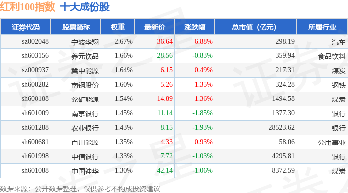 证券之星消息,10月29日,红利100(399411)指数报收于3559.73点,跌0.04%,成交557.1亿元,换手率0.42%。当日该指数成份股中,上涨的有44家,四方股份以10.01%的涨幅领涨,下跌的有51家,成都银行以5.74%的跌幅领跌。