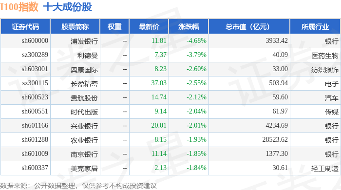 证券之星消息,10月29日,I100(399415)指数报收于7166.43点,涨1.23%,成交721.93亿元,换手率0.37%。当日该指数成份股中,上涨的有55家,泰格医药以11.09%的涨幅领涨,下跌的有35家,浦发银行以4.68%的跌幅领跌。