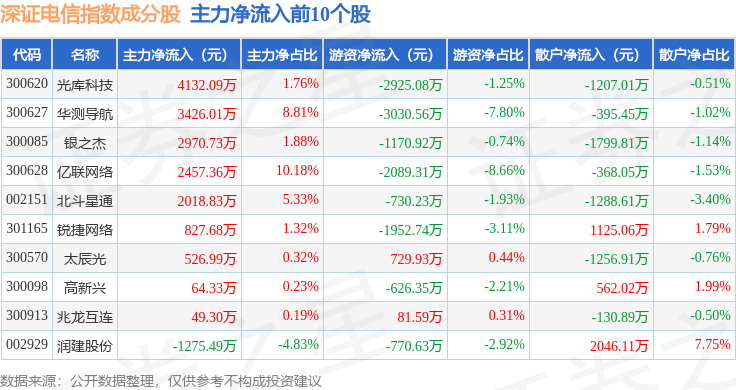 资金流向方面,深证电信(399621)指数成份股当日主力资金净流出合计39.34亿元,游资资金净流入合计21.36亿元,散户资金净流入合计17.98亿元。成份股资金流向详情见下表: