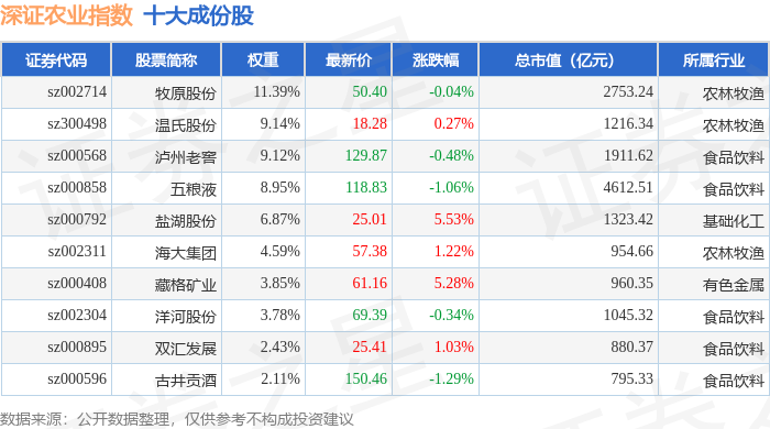 证券之星消息,10月29日,深证农业(399669)指数报收于8586.47点,涨1.02%,成交216.05亿元,换手率1.33%。当日该指数成份股中,上涨的有31家,川恒股份以10.0%的涨幅领涨,下跌的有16家,百润股份以2.62%的跌幅领跌。
