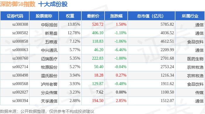 证券之星消息,10月29日,深防御50(399671)指数报收于9970.03点,跌0.24%,成交988.53亿元,换手率1.74%。当日该指数成份股中,上涨的有29家,川宁生物以4.57%的涨幅领涨,下跌的有20家,中兴通讯以6.46%的跌幅领跌。