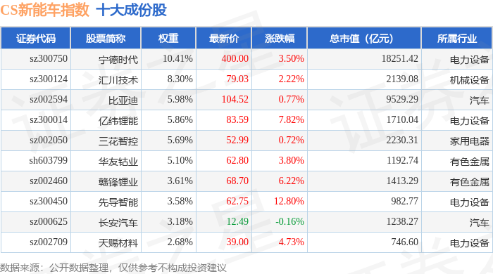证券之星消息,10月29日,CS新能车(399976)指数报收于4524.35点,涨3.85%,成交1289.94亿元,换手率4.28%。当日该指数成份股中,上涨的有46家,贝特瑞以19.38%的涨幅领涨,下跌的有4家,威迈斯以3.01%的跌幅领跌。