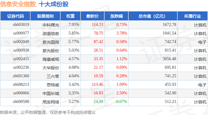 证券之星消息,10月29日,信息安全(399994)指数报收于1958.4点,涨1.07%,成交556.84亿元,换手率3.18%。当日该指数成份股中,上涨的有39家,国盾量子以11.09%的涨幅领涨,下跌的有24家,佳缘科技以13.29%的跌幅领跌。