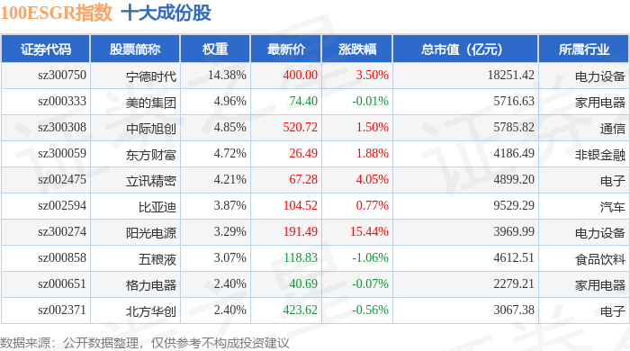 证券之星消息,10月29日,100ESGR(470027)指数报收于8583.01点,涨2.01%,成交2368.31亿元,换手率1.39%。当日该指数成份股中,上涨的有59家,阳光电源以15.44%的涨幅领涨,下跌的有21家,中兴通讯以6.46%的跌幅领跌。
