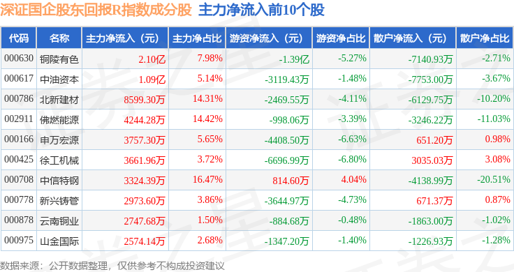 资金流向方面,深证国企股东回报R(470064)指数成份股当日主力资金净流出合计7.73亿元,游资资金净流出合计2.48亿元,散户资金净流入合计10.21亿元。成份股资金流向详情见下表:
