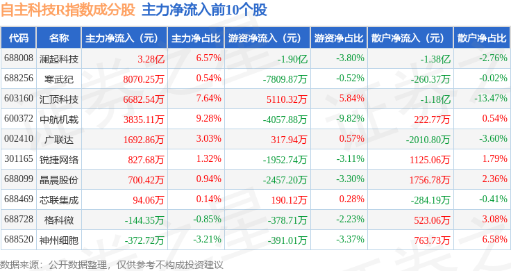 资金流向方面,自主科技R(480033)指数成份股当日主力资金净流出合计62.99亿元,游资资金净流入合计33.51亿元,散户资金净流入合计29.47亿元。成份股资金流向详情见下表: