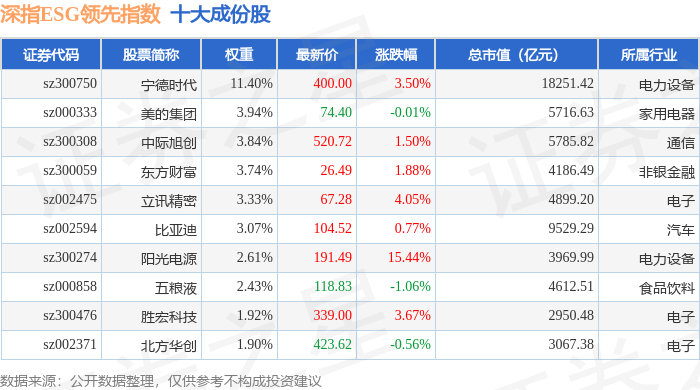证券之星消息,10月29日,深指ESG领先(970029)指数报收于14729.55点,涨2.15%,成交3732.75亿元,换手率1.9%。当日该指数成份股中,上涨的有150家,阳光电源以15.44%的涨幅领涨,下跌的有43家,中兴通讯以6.46%的跌幅领跌。