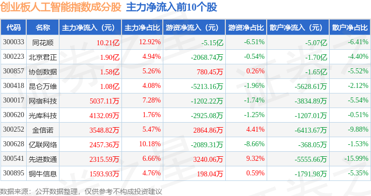 资金流向方面,创业板人工智能(970070)指数成份股当日主力资金净流出合计16.7亿元,游资资金净流入合计10.18亿元,散户资金净流入合计6.52亿元。成份股资金流向详情见下表: