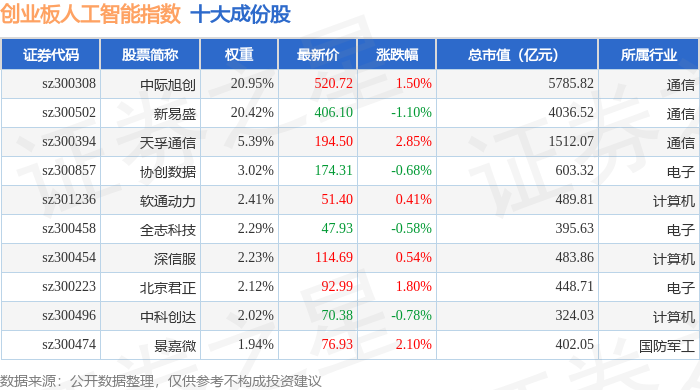 证券之星消息,10月29日,创业板人工智能(970070)指数报收于5575.12点,涨0.56%,成交1005.35亿元,换手率3.35%。当日该指数成份股中,上涨的有27家,联特科技以14.95%的涨幅领涨,下跌的有20家,恒信东方以4.55%的跌幅领跌。