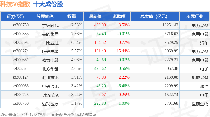 证券之星消息,10月29日,科技50(970080)指数报收于3317.76点,涨2.35%,成交1763.64亿元,换手率2.0%。当日该指数成份股中,上涨的有42家,阳光电源以15.44%的涨幅领涨,下跌的有8家,中兴通讯以6.46%的跌幅领跌。