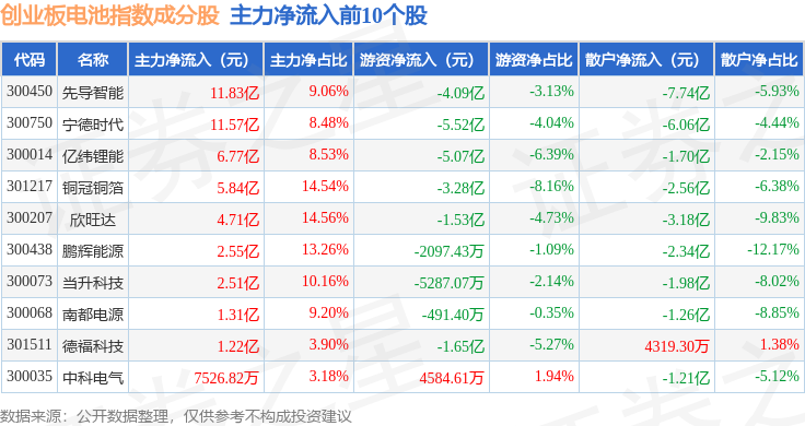 资金流向方面,创业板电池(970081)指数成份股当日主力资金净流入合计42.57亿元,游资资金净流出合计17.81亿元,散户资金净流出合计24.77亿元。成份股资金流向详情见下表:
