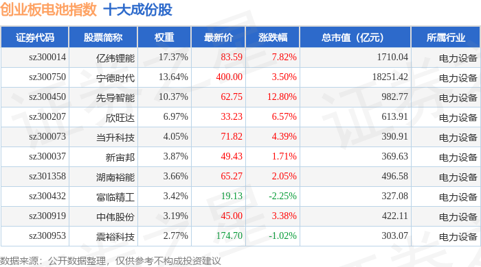 创业板电池(970081)指数十大成份股详情如下: