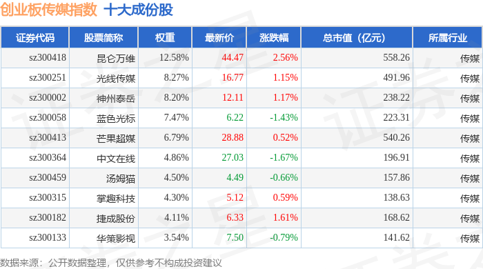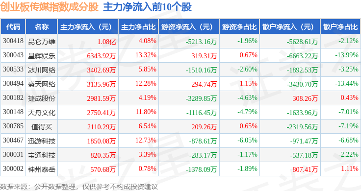 资金流向方面,创业板传媒(970084)指数成份股当日主力资金净流出合计4.8亿元,游资资金净流出合计3881.85万元,散户资金净流入合计5.19亿元。成份股资金流向详情见下表: