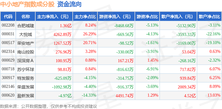 资金流向方面,中小地产(971002)指数成份股当日主力资金净流出合计3.18亿元,游资资金净流出合计6955.56万元,散户资金净流入合计3.88亿元。成份股资金流向详情见下表:
