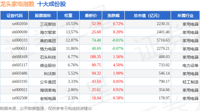龙头家电(980028)指数十大成份股详情如下: