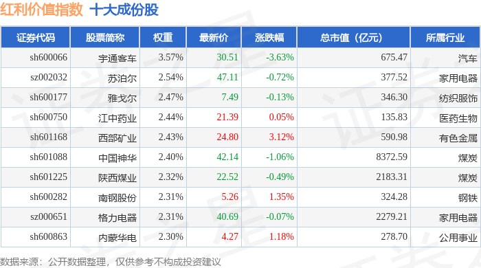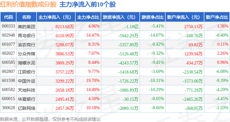 资金流向方面,红利价值(980103)指数成份股当日主力资金净流出合计9.47亿元,游资资金净流出合计2.92亿元,散户资金净流入合计12.39亿元。成份股资金流向详情见下表: