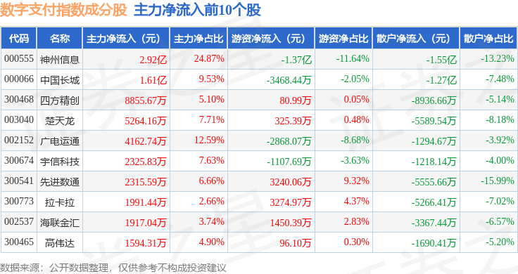 资金流向方面,数字支付(980113)指数成份股当日主力资金净流出合计5.12亿元,游资资金净流入合计1.86亿元,散户资金净流入合计3.26亿元。成份股资金流向详情见下表: