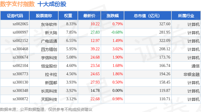 证券之星消息,10月29日,数字支付(980113)指数报收于1931.36点,涨1.32%,成交324.68亿元,换手率2.81%。当日该指数成份股中,上涨的有30家,国盾量子以11.09%的涨幅领涨,下跌的有19家,博实结以3.4%的跌幅领跌。
