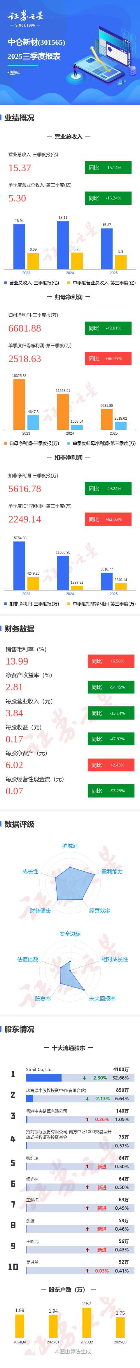 证券之星消息,中仑新材2025年三季报显示,前三季度公司主营收入15.37亿元,同比下降15.14%;归母净利润6681.88万元,同比下降42.02%;扣非净利润5616.78万元,同比下降49.25%;其中2025年第三季度,公司单季度主营收入5.3亿元,同比下降15.24%;单季度归母净利润2518.63万元,同比上升66.96%;单季度扣非净利润2249.14万元,同比上升62.05%;负债率36.98%,投资收益98.25万元,财务费用-240.71万元,毛利率13.99%。