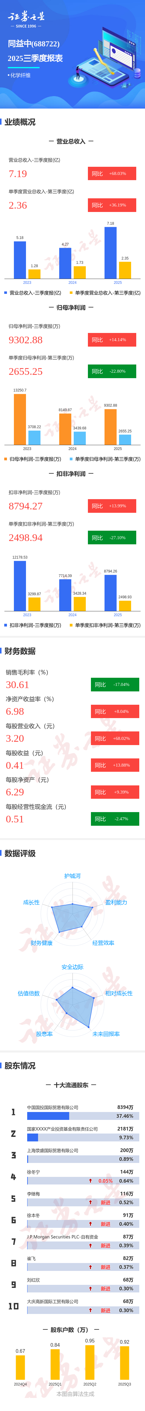 证券之星消息,同益中2025年三季报显示,前三季度公司主营收入7.19亿元,同比上升68.03%;归母净利润9302.88万元,同比上升14.15%;扣非净利润8794.27万元,同比上升14.0%;其中2025年第三季度,公司单季度主营收入2.36亿元,同比上升36.2%;单季度归母净利润2655.25万元,同比下降22.81%;单季度扣非净利润2498.94万元,同比下降27.11%;负债率26.59%,财务费用332.89万元,毛利率30.61%。