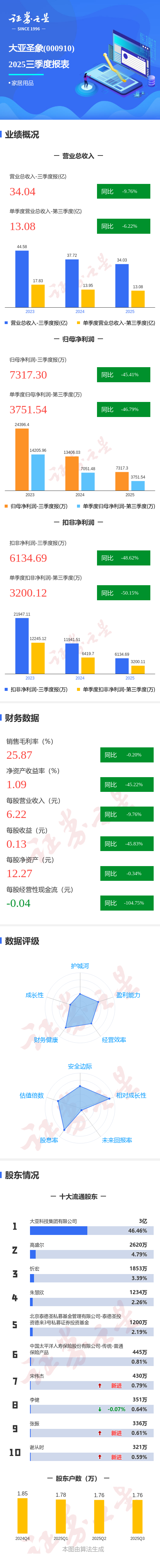 证券之星消息,大亚圣象2025年三季报显示,前三季度公司主营收入34.04亿元,同比下降9.77%;归母净利润7317.3万元,同比下降45.42%;扣非净利润6134.69万元,同比下降48.63%;其中2025年第三季度,公司单季度主营收入13.08亿元,同比下降6.23%;单季度归母净利润3751.54万元,同比下降46.8%;单季度扣非净利润3200.12万元,同比下降50.15%;负债率29.54%,投资收益748.33万元,财务费用-2059.18万元,毛利率25.87%。