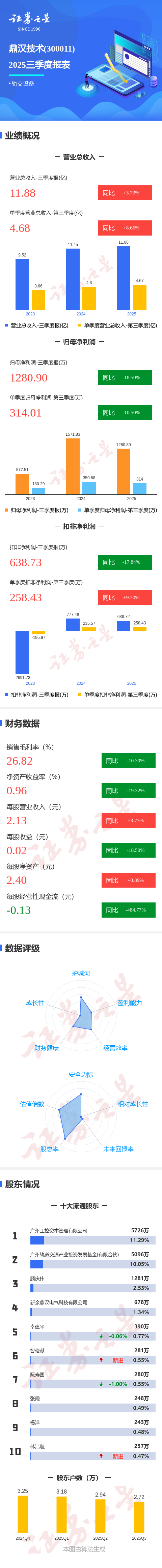 证券之星消息,鼎汉技术2025年三季报显示,前三季度公司主营收入11.88亿元,同比上升3.73%;归母净利润1280.9万元,同比下降18.51%;扣非净利润638.73万元,同比下降17.85%;其中2025年第三季度,公司单季度主营收入4.68亿元,同比上升8.67%;单季度归母净利润314.01万元,同比下降10.51%;单季度扣非净利润258.43万元,同比上升9.7%;负债率65.57%,投资收益28.17万元,财务费用3114.54万元,毛利率26.82%。