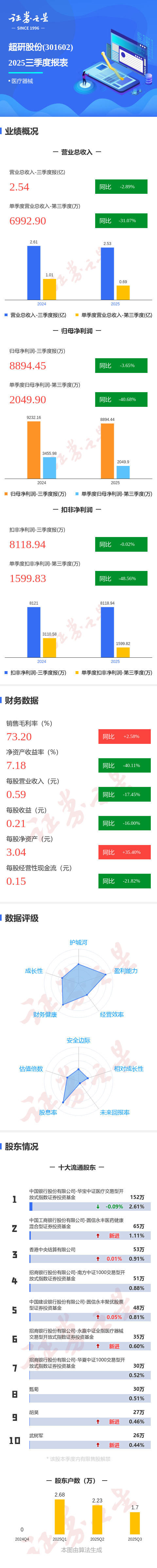 证券之星消息,超研股份2025年三季报显示,前三季度公司主营收入2.54亿元,同比下降2.9%;归母净利润8894.45万元,同比下降3.66%;扣非净利润8118.94万元,同比下降0.03%;其中2025年第三季度,公司单季度主营收入6992.9万元,同比下降31.07%;单季度归母净利润2049.9万元,同比下降40.69%;单季度扣非净利润1599.83万元,同比下降48.57%;负债率7.85%,投资收益310.53万元,财务费用-1159.74万元,毛利率73.2%。