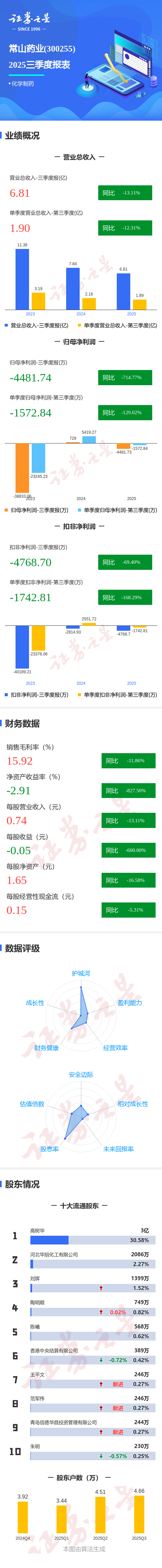 证券之星消息,常山药业2025年三季报显示,前三季度公司主营收入6.81亿元,同比下降13.11%;归母净利润-4481.74万元,同比下降714.77%;扣非净利润-4768.7万元,同比下降69.41%;其中2025年第三季度,公司单季度主营收入1.9亿元,同比下降12.32%;单季度归母净利润-1572.84万元,同比下降129.02%;单季度扣非净利润-1742.81万元,同比下降168.3%;负债率68.26%,投资收益167.18万元,财务费用6567.96万元,毛利率15.91%。