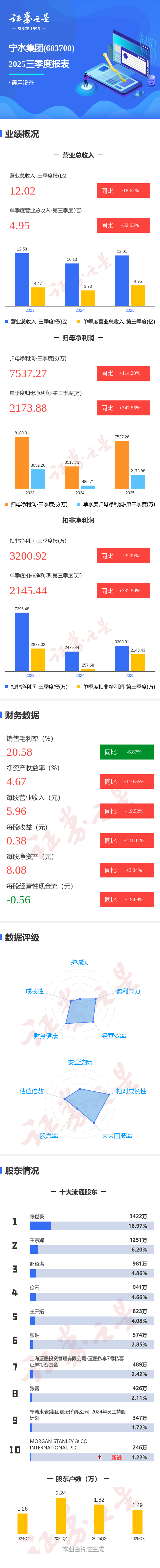 证券之星消息,宁水集团2025年三季报显示,前三季度公司主营收入12.02亿元,同比上升18.62%;归母净利润7537.27万元,同比上升114.2%;扣非净利润3200.92万元,同比上升29.1%;其中2025年第三季度,公司单季度主营收入4.95亿元,同比上升32.63%;单季度归母净利润2173.88万元,同比上升347.57%;单季度扣非净利润2145.44万元,同比上升732.59%;负债率32.03%,投资收益4550.19万元,财务费用-76.64万元,毛利率20.58%。