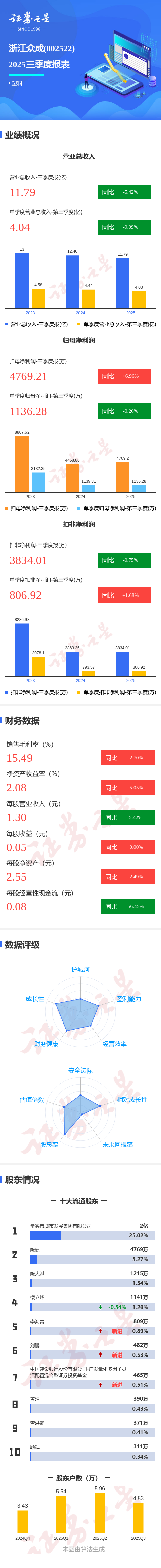 证券之星消息,浙江众成2025年三季报显示,前三季度公司主营收入11.79亿元,同比下降5.43%;归母净利润4769.21万元,同比上升6.96%;扣非净利润3834.01万元,同比下降0.76%;其中2025年第三季度,公司单季度主营收入4.04亿元,同比下降9.09%;单季度归母净利润1136.28万元,同比下降0.27%;单季度扣非净利润806.92万元,同比上升1.68%;负债率35.6%,投资收益313.86万元,财务费用332.17万元,毛利率15.49%。