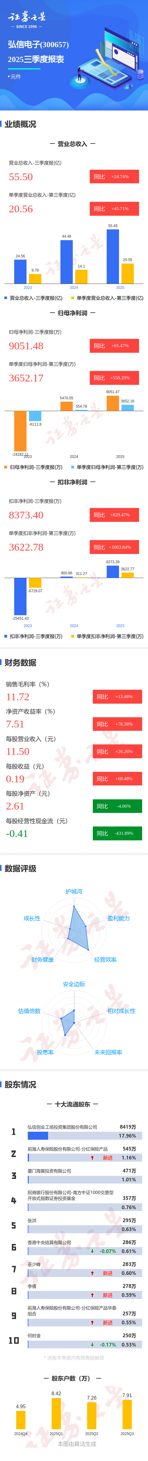 证券之星消息,弘信电子2025年三季报显示,前三季度公司主营收入55.5亿元,同比上升24.75%;归母净利润9051.48万元,同比上升65.47%;扣非净利润8373.4万元,同比上升829.48%;其中2025年第三季度,公司单季度主营收入20.56亿元,同比上升45.72%;单季度归母净利润3652.17万元,同比上升558.3%;单季度扣非净利润3622.78万元,同比上升1063.85%;负债率79.55%,投资收益-1382.55万元,财务费用1.01亿元,毛利率11.72%。